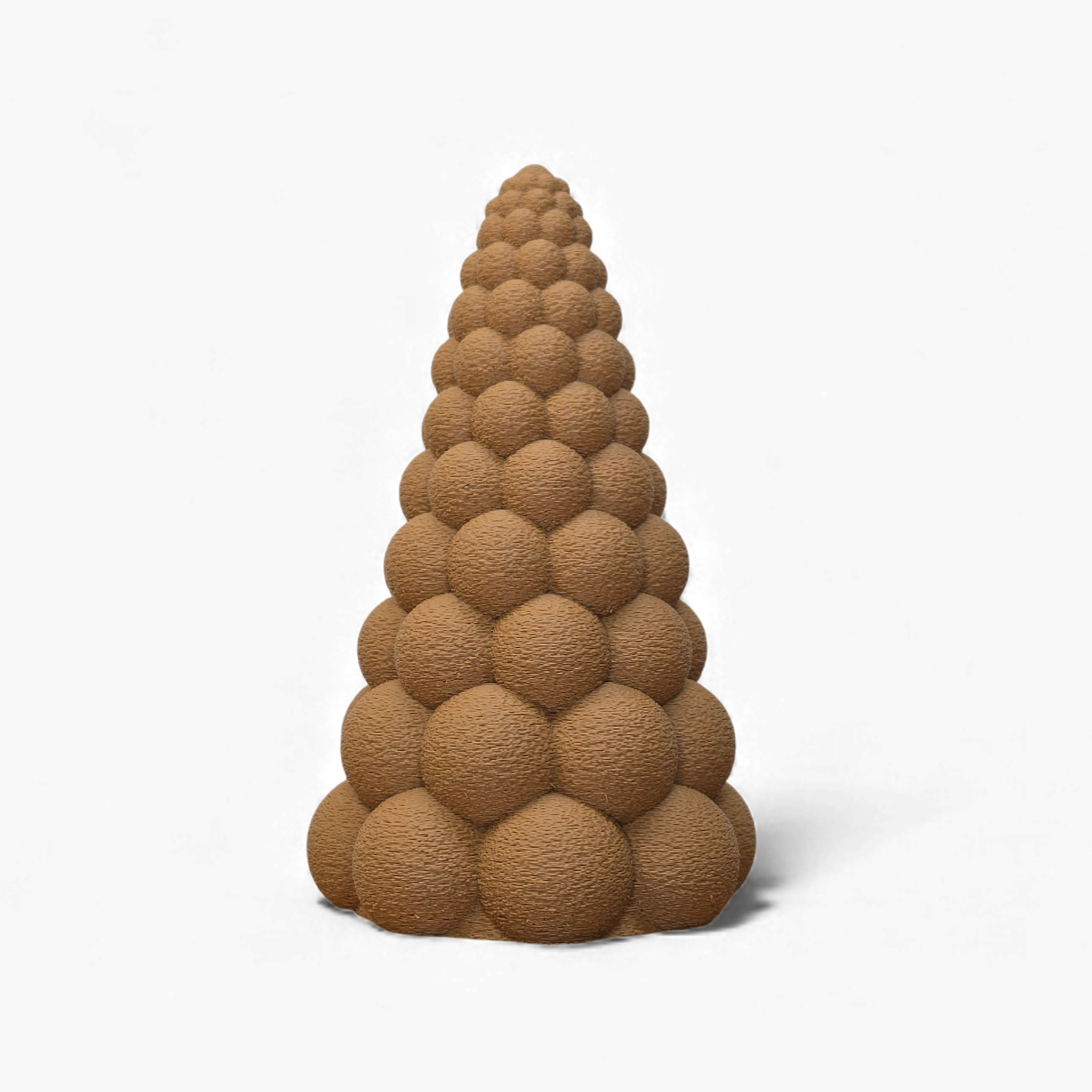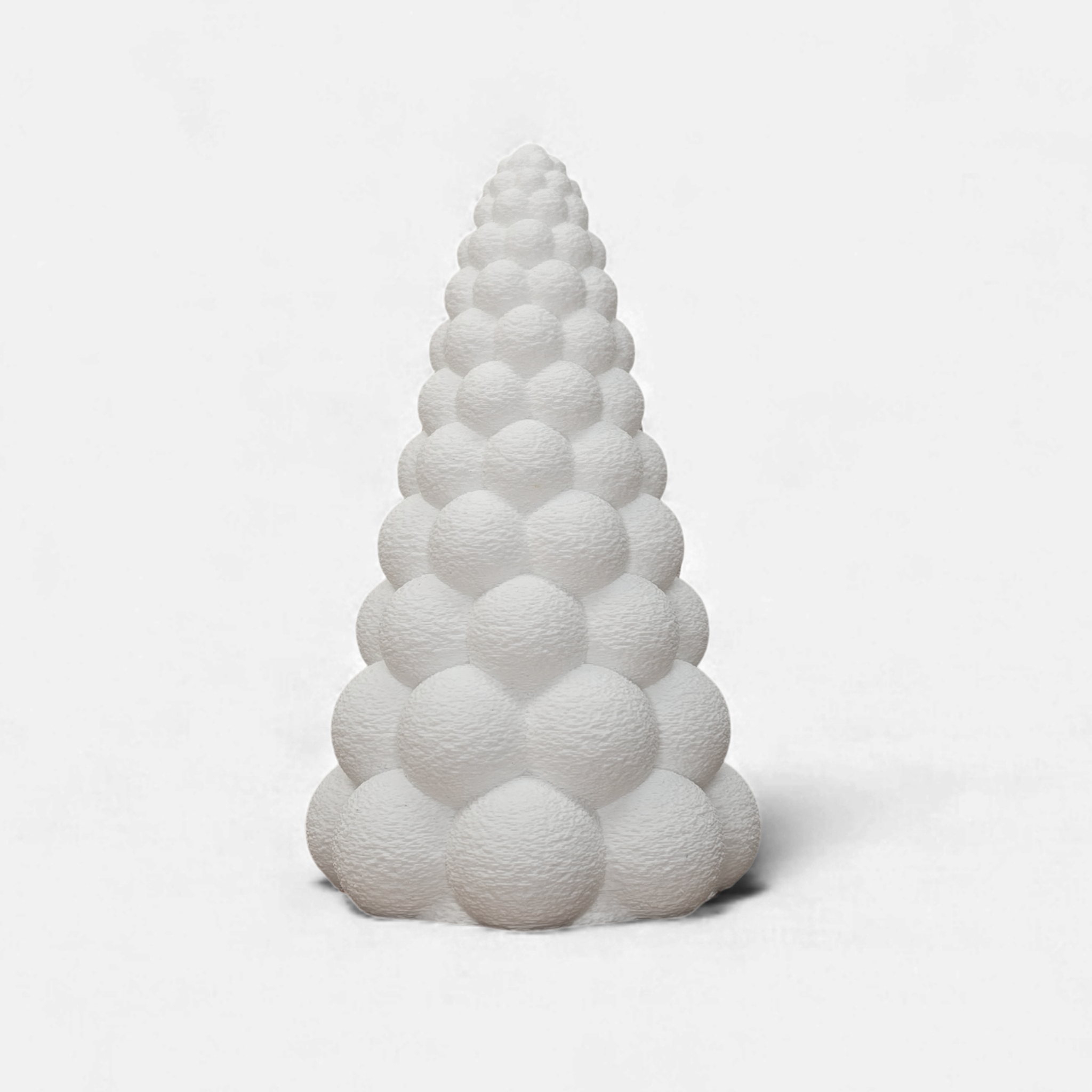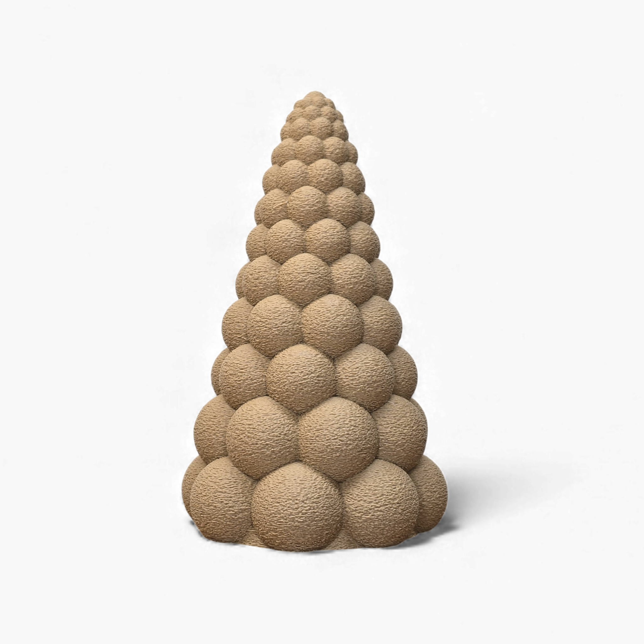 Notre Sapin Fuyu Japandi est une réinterprétation de l'arbre de Noël qui met l'accent sur la texture et la sensation de l'hiver. Cette sculpture, imprimée en 3D, se distingue par sa surface de petites sphères empilées qui donne l'impression d'une accumulation délicate de neige ou de pommes de pin stylisées.